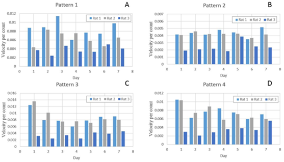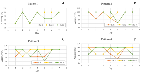 The rat is tested in 4 patterns of complex maze. Figure 6 shows that the accuracies of the rat in moving correctly in each maze pattern are higher than 80%. Figure 7 shows the performance of 3 rats in all the maze patterns. The rat No.3 has performance lower than the rat No.1 and 2. The results show different performance of different rats even under the same condition. Figure 8 shows photos taken during the experiments of 4 patterns of complex maze.