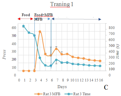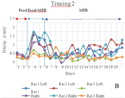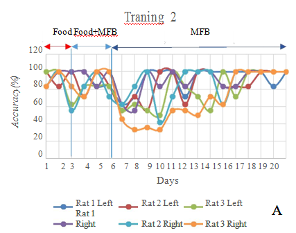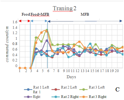 MFB stimulation training: MFB stimulation is used for go straight command. The training field of MFB stimulation is a straight track of two-meter length. Firstly, the rat is trained to walk straight in front direction by providing rat foods in front of the rat along with MFB stimulation. Later, the rat foods are removed and only MFB stimulation is conducted. The rat is trained by MFB stimulation for 6 times a day.