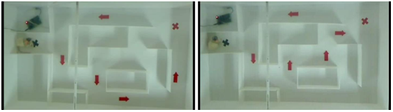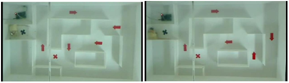 A complex maze training field is conducted in order to train and test the performance of the rat in following the commands. The starting point is shown by the green cross sign while the destination point is shown by the red cross sign. The rat has to walk along the assigned route as shown on the ground with blue arrows. The rat is guided by both MFB stimulation and left-right SI stimulations during walking. If the rat heads to correct direction as trained in the earlier training program, the rat will be rewarded with rat foods. The training program completes when the rat completes roaming from the starting point to the destination point following the assigned route. The rat is trained in the complex maze three times a day.