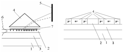 The functional diagram of a sensor element is provided on figure 1a. The coherent optical radiation from the laser is entered into a waveguide (2), extends in it and is exhausted from a wave guide by means of diffraction grating. In the presence of the researched component (7) there is a change of place of the radiated peak. This shift registers by a CCD-array (5). The prism (4) is used for support of a wide angle range the reradiated optical beam on boundary a waveguide - an integumentary layer. When testing when filling grooves of a diffraction grating with polar ammonia molecules the maximum of the angular reflected light distribution displaces for several angular minutes. The solid line schematically showed the course of optical radiation out of the waveguide component in the presence of the researched substance, by a dotted line without it. The focusing system isn't shown on Figure 1. For support of high metrological characteristics the wide-aperture heterogeneous waveguide structure which diagram is provided on Figure 1B is used. In this structure areas with high concentration of two types of the free charge carriers (electrons and holes) are in addition created. These additional areas provide small optical losses and unrepresentative single-mode behavior for a thin-film wide-aperture (over 10 microns) high-contrast SOI waveguide. High-doping n+ and р+ areas are designed to suppress modes of the higher orders which inevitably arise in the wide aperture waveguides. It attracts the sharp growth of parasitic losses. Width Wn+ of the n+ area is approximately equal to a half of a core width W0. Width Wp+ of the р+ area is approximately equal to W0/4. Therefore, Wn+=2Wp+. Such alternating construction provides the high level of modal selection, suppression of re-radiation through a waveguide lateral face, the general electro-neutrality of the waveguide structure.