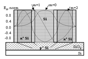 Properties of a fundamental m0 - mode (Figure 2), except for smaller optical losses, in general are similar to properties of a zero mode of the standard semiconductor waveguide created at the expense of a gradient of the free charge carriers. Fundamental differences arise for all other modes (m1, m2,…) a heterogeneous waveguide. Their effective refraction indexes are close or less refraction index of area 2 on Figure 1B. Their optical fields occupy all area of a waveguide. Therefore, the share of energy which falls on the dissipative area is many times more, than at a m0 mode (Figure 1B). These modes inevitably have the considerable additional attenuation on the free carriers which grows with number of a mode. These outputs are confirmed by results of simulation. Calculations were carried out by BMP and FDTD methods. By way of illustration, for example, it is shown that high selection of a fundamental mode is reached for an optical waveguide with the total aperture of 35 microns and W0=11 microns. At the same time its optical losses very low also make -1.5 dB for the doping level is 9.0x1017 cm3. Additional attenuation for the higher orders modes on the free charge carriers concerning the level of attenuation of a fundamental mode makes-23.6 dB for m1 mode and-31.4 dB for m2 mode.