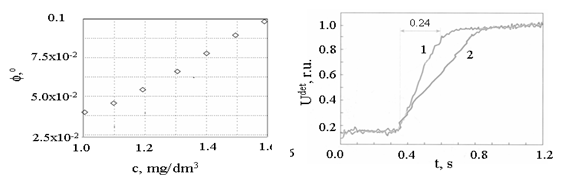 Choice and optimization of topology of the SOI waveguide structure with a diffraction grating explicitly are considered in.1 For structure with thickness: a waveguide - 210 nanometers, the burriex oxide - 940 nanometers, apertures: W0 - 10.2 microns, Wn+ – 5.1 microns and Wр+ - 2.6 microns, a doping concentration of n+ and р+ areas - 5х1020 cm3, the groove minimum width is 22 nanometers and depth is 100 nanometers on wavelength of 1550 nanometers maximum efficiency of an output is equal to 76%. The experimental dependence is given in Figure 3A. It is important to mark that this shift can be watched easily, fixing angular provision of a peak of intensity, not resorting to spectral instruments. The temporal response of a sensor for different concentration of ammonia is given in Figure 3B.