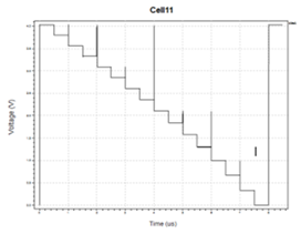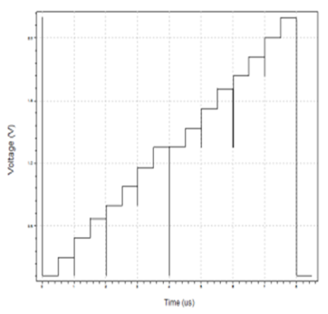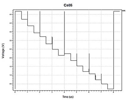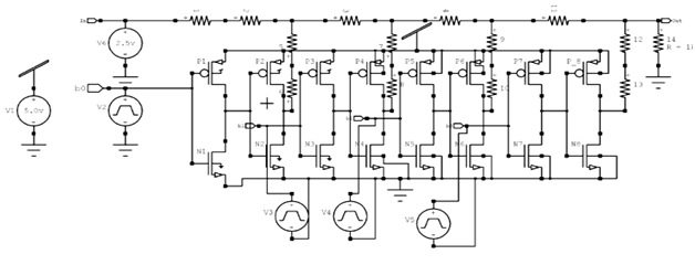 Figure 2 shows the R2R D2A converter using CMOS inverter. CMOS inverter is attached in series with next CMOS inverter for 1- bit and the R-2R series is attached with it, and then it gives output the same bit as input. The same process is repeated for all the bits. Figure 3 presents output in the analog form. The output Fig. 3 of the R2 D/A converter is followed by the voltage as the voltage at node (n-1) is given by-