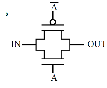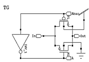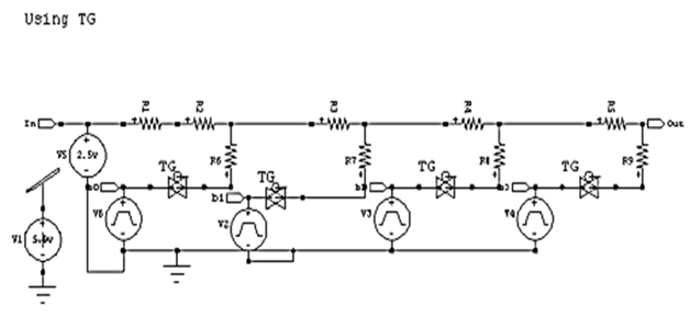 Transmission Gate (TG) is used in digital CMOS circuit design to pass or not pass a signal23-25 In other words, It acts like switch. The gate is made up of the parallel connection of p- and n- channel MOSFET. When S is high then the transmission gate pass the signal on the input to the output. Transmission gate using CMOS and its circuit and symbols are shown in Figure 4-6. In the Figure 7 R2R D/A converter is using TG. In this b0, b1 ,b2 and b3 is the digital signal . The TG is a good switch and when the digital pulse is given to all the bit it gives the output Figure 8 corresponding to the analog signal.