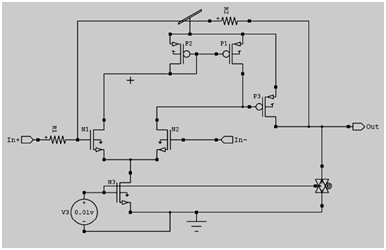 The Figure 9 shows the internal circuit of op-amp which is used in the R-2R D/A converter using op-amp. When data is in binary form, the 0's and 1's where the logic zero may be a value up to 0.8 volts and the 1 may be a voltage from 3 to 5 volts.26-28 The data can be converted to clean digital form using gates which are designed to be on or off depending on the value of the incoming signal. Data in clean binary digital form can be converted to an analog form by using a summing amplifier. For example, a simple 4-bit D/A converter can be made with a op-amp. where the D's take the value 0 or 1. The digital inputs could be TTL voltages which close the switches on a logical 1 and leave it grounded for a logical 0. This is illustrated for 4 bits, but can be extended to any number with just the resistance values R and 2R. Input summing amplifier. More practical is the R-2R Network DAC. In the Figure 10, the negative input is at virtual ground, therefore the current through RTH=0.