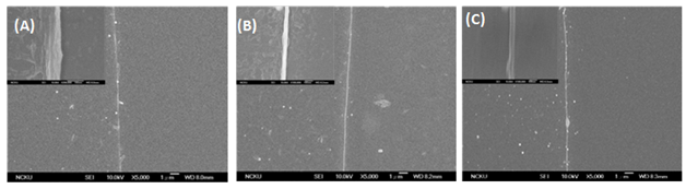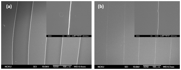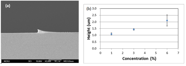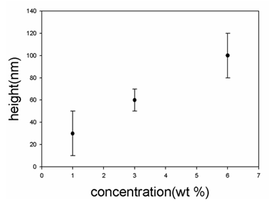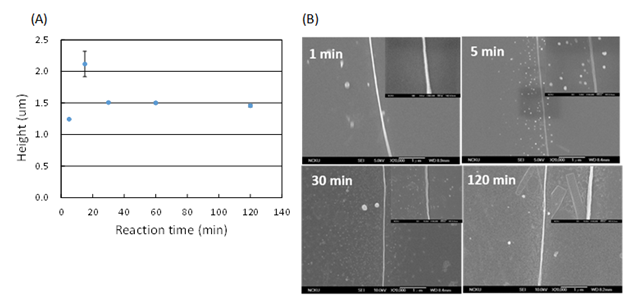 Figure 3A shows the cross-sectional view of the line structure. Similar to our previous study, a triangular-like shape was observed. The height of these line structure (measured from the bottom to the tip) increased as the concentration of the copolypeptide solution increased, which is shown in Figure 3B. It is worthy of mentioning that when the concentration was less than 1wt%, the continuous line structure could not be formed. On the other hand, as the concentration exceeded 6wt%, the solution became much more viscous that the solution could not fill the microchannels. After the sintering process, the copolypeptide was removed and the nanowire array was formed due to the fusion of Au NPs. Figure 4 shows the SEM images of the gold nanowires on a glass substrate obtained from using 1, and 3, and 6 wt% of copolypeptide solutions. For 1wt%, part of the line structure did not seem to be clearly formed. Despite different solution concentrations, the width of the nanowires was approximately 50nm. However, the height of the nanowires increased when the concentration increased as shown in Figure 5. As to the reaction time, there seems to be no influence on the height of the copolypeptide line structure and the width of the nanowires as shown in Figure 6A & Figure 6B, respectively when 3wt%