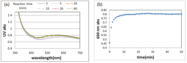Figure 2 (A) The UV-vis spectra for different reaction times (B) The time-resolved UV-vis measurements. 3wt% solution was used.
