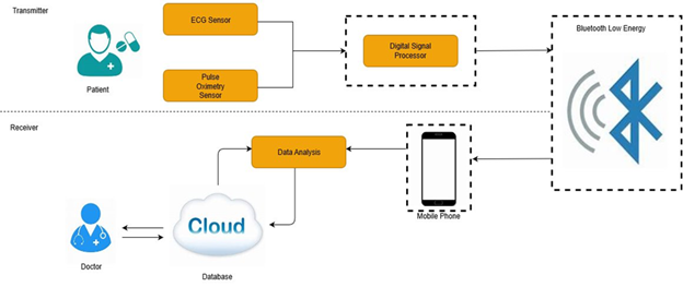 The oxygen level of a patient can be used to predict and detect chronic obstructive pulmonary diseases (COPD). COPD can lead to hypoxia, a condition marked by low oxygen levels. Hence, CVD are arguably the most comorbidities in chronic obstructive pulmonary disease (COPD), and their presence is associated with increased risk for hospitalization and CVD-related mortality.16–19 People suffering from chronic diseases usually need constant monitoring of their vital signals. These biomedical signals provide information about the patient health status, allow for better diagnosis and treatment. Unfortunately, in conventional healthcare systems, electrocardiogram (ECG) and SpO2 are monitored in fixed places like hospitals, so the patient has to come to the hospital to diagnose some heart disease.20 Electrocardiogram (ECG) represents the electrical activity of the heart, and it reveals the health status of the heart.20 NP medical development and the adoption of telemonitoring, monitoring of patient’s physiological information is made easy which leads to reduction in the current burden on public health system and promote routine health self-check by mobile healthcare user. Hence, the development of portable, cost-efficient system with a reliable database that is easily accessible with Mobile phones has become most essential in telemonitoring. In recent years, several works have attempted to approach the challenge of real time monitoring, designing monitoring systems based on microcontrollers and small screens. Interfacing of Biomedical Diagnostic Devices with Internet of Things (IoT) is an example of such works.12 NP a multi-parameter portable healthcare device monitor based on android smart phone, Bluetooth Low Energy and a microcontroller unit is presented. It is a low-cost multi-parameter monitoring system based on a low-power ATmega328 microcontroller, with data acquisition units comprising the AD8232 and the MAX30100 sensors. The controller converts the analog signal into a digital signal via an inbuilt analog to digital converter which conditions and filters it. The signal is then transmitted via a Bluetooth module. The real time data is received by a companion android base application that provides data communication via a distributed protocol and displayed in real-time.