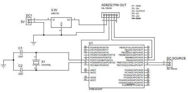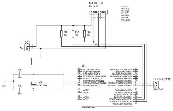The digital signal processor (DSP) is a microcontroller based on the ATMEGA328 microprocessor. The DSP filters, calculates, and prepares the measurements for transmission. The ATmega328 is an 8-bit AVR RISC-based microcontroller that combines 32KB ISP flash memory with read-while-write capabilities, 1KB EEPROM, 2KB SRAM, 23 general purpose I/O lines, 32 general purpose working registers, three flexible timer/counters with compare modes, internal and external interrupts, serial programmable USART, a byte-oriented 2-wire serial interface, SPI serial port, 6-channel 10-bit A/D converter (8-channels in TQFP and QFN/MLF packages), programmable watchdog timer with internal oscillator, and five software selectable power saving modes. The device operates between 1.8 – 5.5V. Figure 2 & Figure 3 show the interfacing of the DSP with the AD8232 module and the MAX30100 module respectively.