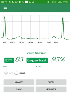 The Portable Healthcare Monitoring Device (PHMD) was subjected to tests. The ECG waveform, heart rate and oxygen level values were acquired, processed by the digital signal processing unit, and transferred to the android application by the Bluetooth. At the receiving end, the body vital signs were displayed on the mobile application. The waveform of the bio signal and measured vital signs are shown in Figure 8 for a subject as displayed on the android application.