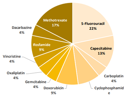 Cytotoxic drugs such as 5-fluorouracil, epirubicin, doxorubicin, cyclophosphamide, cisplatin, docetaxel, paclitaxel, carboplatin, vinblastine, phosphamide, mitomycin C, etoposide, etc. are used to fight cancer. 5-Fluoroura and cisplatin are the most common anticancer drugs that cyclophosphamide can use. Anti-neoplastic agents are also traditionally divided according to their origin or mechanism of action. The main groups are: 16 alkylating and alkylating agents, antimetabolites, antitumor antibiotics, plant alkaloids, miscellaneous agents, hormonal agents. Plant alkaloids bind to microtubule proteins during metaphase and cause mitotic arrest. The cell cannot divide and dies. This group is mainly the cell cycle phase specific to the M phase. Miscellaneous agents differ from each of the major classes of cytotoxic agents. The agents are asparaginase and hydroxyurea. Topoisomerase inhibitors prevent re-alignment of DNA strands and maintain single-strand breaks. Hormonal agents alter the intracellular/extracellular environment. Anti-inflammatory agents are usually prescribed in different combinations of doses and times. The specific regimen is referred to as a protocol. The protocol may use one or as many as five or six different antineoplastic agents. Choosing the right protocol should be based on the type of tumor and its grade. The most common auxiliary drugs used in our study are ondansetron, paracetamol, pethidine, fenargan, pantoprazole, lactulose, ranitidine, and peptard Table 1, 2 & Figure 1.