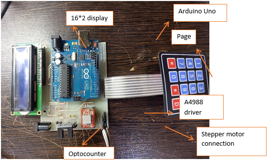 The Arduino Uno board runs the program programmed on it. Keyboard, DS 18B20 sensor and optocounter are also controlled from it. 5V generated by Arduino Uno board is connected to optocounter, display and A4988 driver. The stepper motor is also connected to the A4988 driver for movement. By executing the commands, the display shows the output of the syringe and the patient's body temperature.