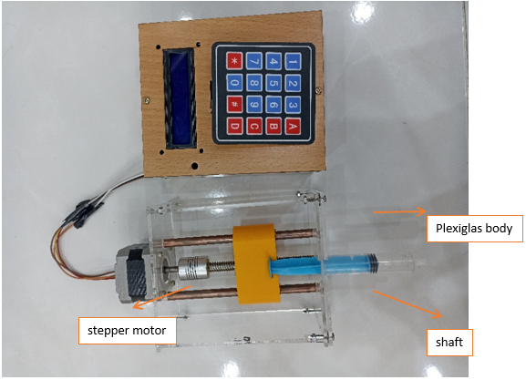 A stepper motor is used for rotation. In general, bridge motors work by successive activation coils located in the stator. The rotor contains a toothed iron core, permanent magnets, or both. The stepper we use consists of a toothed permanent magnet. The most important point is to create a state transition diagram for ignition coils based on the optimal performance of the control circuit; when the controller is not active, the modes do not change and thus the motor stops. However, when the controller is active and DIR is low, the modes flip up, causing the motor to move forward. When the controller is active and DIR is high, the modes rotate downward, causing the motor to move backwards. The housing body of the device is designed with Simplify3d software and cut on a plexiglass sheet with a 3D printer. Two shafts are used on the side of the housing for strength and to prevent slipping when the stepper motor moves. Two shafts are used on the side of the housing for strength and to prevent slipping when the stepper motor moves. The syringe is placed in the chamber and starts its injection with the movement of the stepper motor Figure 5.