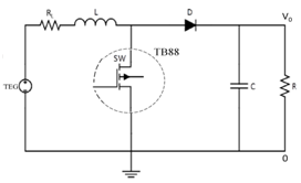 Theoretic analysis: While the switch of transistor SW, as the block diagram of TB88 step-up circuit sketched in Figure 3, is being “ON” state, the charging to electric inductance L starts working and the power supplied from TEG chip will be fully absorbed. Here diode D is used to prevent the back-current from capacitor. Oppositely, a time-delay charging to capacitor, due to the non-synchronization, occurs at the energy- stored electric inductance as the switch of transistor is cut off. Such periodic charge and discharge process, the working current flowing through diode D will lift up the terminal voltage of capacitor C. Based on Kirchhoff law, power supplied from source, yielded in Eq. (1), will be fully dissipated at loaded part as well as the series of electric inductance and electric resistance. Here Vs indicates the power supplied from TEG thermoelectric chip, VO: output voltage of circuit, IL: current flowing across electric inductance, ID: output current of circuit and RL: series resistance.