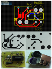 According to the desired working demand, chip-TB88 IC with compatible electric components is selected. Using commercial package “Altium Designer summer 09” develops the layout of PCB (print circuit board see Figure 5) in advance and then install the testing components on the etched current board. After completing the step-up circuit (Figure 5), a series of test on characteristic performance, compared to the commercial product CE8301, will be undergone consecutively while the power is ready to initiate the step-up device.