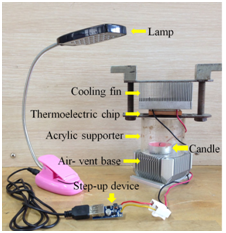 Accompanied with the step-up device mentioned above, an exhausted heat–generation experimental unit, shown in Figure 6, primarily consists of thermoelectric chip, heat-conduction plate, cooling fin, exhausted heat source (candle), acrylic volumetric supporter, porous base as well as desk lamp. Here the generating unit, including heat-conduction plate and cooling fin closely compacted on the bottom and top surface of thermoelectric chip, is deployed above the acrylic supporter with candle fire positioned inside, and below a porous base is mounted to induce air flow. Besides, both thermometers detecting the surficial temperature difference will be equipped on the cold and hot surface of thermoelectric chip.