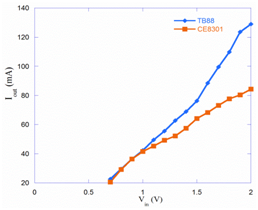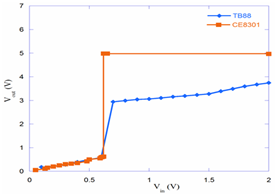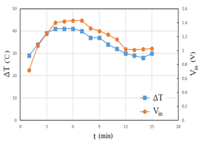 Prior to our discussion, the investigation of thermoelectric performance for TEG-12703 is desired. Here electrical potential induced from the thermoelectric chip, based on the both concaved profiles distributed within the experimental duration of 15 minutes in Figure 7, is found to be closely dependent on the finite temperature difference between the colder surface, subjected to cooling fin, and hotter surface heated by candle-burning exhausted air. Here the thermal voltage Vin, 0.7~1.4V, related to surficial temperature difference ΔT, 30~40oC, could be generated from thermoelectric chip. And the maximum temperature difference 40oC, occurring at t=6 min, implies the heat diffused to hotter surface might be instantly conducted into environment by way of cooling fin. As thermal balance approaches at the fifteenth minute, the voltage 1.05V, induced from the surficial temperature difference at 30oC, is still found too small to motivate the practical application unless the manipulation of set-up circuit is involved. To assess the suitability of self-designed TB88 IC and commercial CE8301 device embedded in the step-up circuit, the start-up voltage for both should be individually investigated beforehand. While regulate power supply by term, the needed potential, in Fig.8, is found to be nearly 0.6V, i.e. voltage delivered from TEG thermoelectric chip, as discussed in Figure 7, seems to be enough to break through the energy barrier and initiate both step-up converters.
