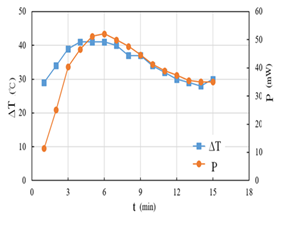 However an augmented discrepancy, in Figure 8, exists between a linear increasing from 3V and stable voltage 5V, individually accessed from TB88 and commercial CE8301 IC, as input voltage more than 0.6V is subjected. Corresponding to the induced voltage resulted in Figure 8, a more flexible operation, based on the higher circuit current of 20~130 mA delivered from TEC thermoelectric chip in Figure 9, could be conducted using TB88 IC while compared to the smaller circuit current of 20~80 mA conveyed with CE8301 device . Here also reveals that a special advantage might be held by TB88 chip and the superior discrepancy, power supplied from thermoelectric chip, will be further enlarged if the thermoelectric voltage increases. Subsequently we will turn to survey the power output from the TB88 step-up circuit specified. In Figure 10, a time varying power,10~40 mW, as well as surficial temperature difference of thermoelectric chip, 30~40oC, will be depicted, and the peak value of 50mW ,delivered at temperature difference 42oC, is primary attributed to the minimum net heat flux ,induces the maximum power generation, across the thermoelectric chip.