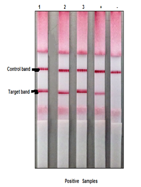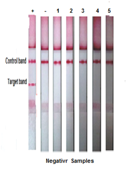 Presence of all two lines (control, and target) along the strip indicates valid positive results. Presence of only one line at control (i.e control band only) indicates a valid negative result. Illustration of LATE-PCR LFA Strip results are shown in Figure 3 below.