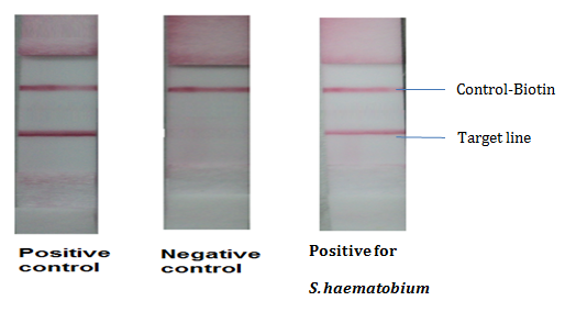 The capture reagents used in the development of S.haematobium LATE-PCR dipstick, which were biotinylated anti-mouse IgG and monoclonal anti-FITC(anti-FITC).The concentration of each capture reagent was optimized in order to obtained the optimum intensity of the red line on the LFA strip. The optimization of the capture reagents was initiated using the control red line which is biotinylated anti-mouse IgG. The biotinylated anti-mouse IgG was diluted serially in 10m M PBS (pH 7.4).One microliter (ul) of each diluted biotinylated anti-mouse IgG was dispensed into the nitrocellulose membrane and dried in drying cabinet for 24 hours with RH 20%, to 30%. An amount of 140ul of a running buffer was dispensed onto the sample pad and then allowed to migrate towards the absorbent pad for 15 minutes. The intensity of red line was then visualized.