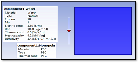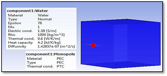 The half-wave dipole antenna has been designed at a resonant frequency 2.45GHz. The proposed design parameters of the half-wave dipole antenna have been simulated by using the CST Microwave Studio 2019 software. The design of the dipole antenna used in this study is as shown in Figure 1. The summary of the dipole antenna dimension designed in this study can be referred in Table 1. In order to design a hyperthermia applicator simulation model, the design dipole antenna of this research needs to be extended by adding a water bolus model in the simulation design. The aims of the simulation which is using the water bolus model as a material in the simulation techniques is to measure the SAR in the water bolus model. By this simulation, the heating value of the design antenna as hyperthermia applicator can be determined. The time exposure of the applicator could also be estimated based on this simulation. The design hyperthermia applicator model in this research is as shown in Figure 2 & Figure 3. In this research, the half-wave dipole antenna as hyperthermia applicator simulation model is designed by using the perfect electric conductor (PEC) and a water bolus model in cubic shape. The dimension of the normal water bolus model is 100mm x 100mm x 100mm for thick, high and width respectively. The epsilon value (permittivity) of the water is 78. The dynamic viscosity of the water bolus model is 1. Besides, it can be seen in Figure 3 that the electric conductivity of the water bolus model is 1.59S/m. The density of the normal water is 1000 kg/m3 while the thermal conductivity is 0.6 W/K/m. Furthermore, the heat capacity of the water bolus model is 4.2 kJ/k/kg while the diffusivity of the model is 0.000000142857m2/s.