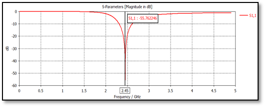 Figure 4 The reflection coefficient or return loss curve of half-wave dipole antenna simulation work at 2.45 GHz.