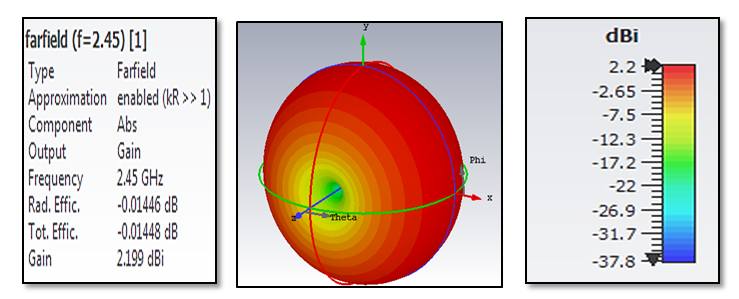 Based on the reflection coefficient curve of dipole antenna of this research shown in Figure 4, the reflection parameter of the antenna at 2.45 GHz is about -55.762246dB. It can be seen that the reflection coefficient of this antenna has more exceptional performance as the functional return loss of an antenna should be at least -10dB. Again, by referring to this graph the antenna seems to do not have a mismatch issue because it begins at 0dB.The gain (IEEE) of the half-wave dipole antenna design in this study at 2.45 GHz as calculated in CST software is about 2.199dBi, as demonstrated in Figure 5. Besides, its radiation and total efficiency are about -0.01446dB and -0.01448dB respectively.