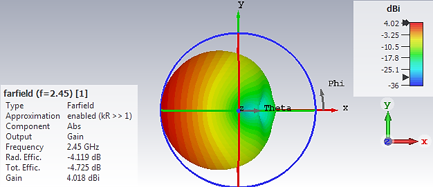 Figure 5 The far-field radiation pattern in gain (IEEE) output from dipole antenna simulation work at 2.45 GHz.