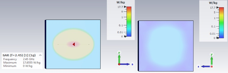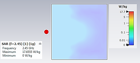 The far-field radiation pattern based on gain of the hyperthermia applicator of this study is estimated as 4.018dBi at 2.45 GHz. The maximum radiation can be seen in the red colour, and the minimum radiation in blue colour as shown in Figure 6. The radiated efficiency of this applicator is about -4.119dB and the total efficiency is about - 4.725dB. Comparing this radiation pattern to the half-wave dipole antenna’s radiation pattern, it can be observed that this hyperthermia applicator’s radiation pattern has directional pattern type which is towards the water bolus model. The maximum value of the radiation pattern has been increased for this applicator. The SAR which is used to measure the absorbed energy in water bolus by the hyperthermia applicator at 2.45GHz calculated in units of watts per kilogram using CST environment tools are as shown in Figure 7. The maximum SAR distribution value of this water bolus model viewed from the side is about 0.05 W/kg until 0.1 W/kg which fulfil the requirement of SAR level in 1g mass at 1.6W/kg or below. Most of the human tissue mainly consists of water, which contributes to high conductivity. Based on these results, the SAR values in this simulation work is said to depend on the distance of the hyperthermia applicator and the water model and also the conductivity value of the water.
