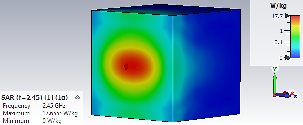 The distribution of SAR at top side of the water model in this simulation as based on 1g averaging mass is ranging from 0 W/kg until 17.6555W/kg. This value is higher than the FCC international standard that supposedly at and below than 1.6 W/kg at 2.45GHz as a protection value to the human body tissues. The maximum distribution value of the SAR in this side is more than the bottom side as shown in Figure 8, as this area’s distance is quite far from the antenna. Based on this figure, the SAR distribution at the bottom side of the water bolus model produced by the hyperthermia applicator is at minimum value of 0.01W/kg and maximum value of 0.1W/kg. The low value may also due to the conductivity value of the water. Figure 9 shows the 3-dimensional view of the SAR distribution of the water bolus model produced by the half-wave dipole antenna as hyperthermia applicator in hyperthermia applicator simulation model. As can be seem in this figure, the maximum value of the SAR distribution in 1g of the water bolus model produced by this hyperthermia applicator is about 17.6555 W/kg at 2.45GHz. In this simulation, the average cell mass used is about 0.00032338g. The SAR power in 1g mass of the water bolus model is about 0.26519 watt, while the average SAR power is about 0.002418219 W/mm3. Besides, the overall SAR value in 1g of this water bolus model exposed to the hyperthermia applicator is recorded as about 0.26519 W/kg which is following the averaging method in SAR calculation results in IEEE/IEC 62704-1. Although the maximum SAR value of this water model exposed to the applicator is higher at the middle of the model, but the SAR value is less than 1W/kg in the surrounding area.