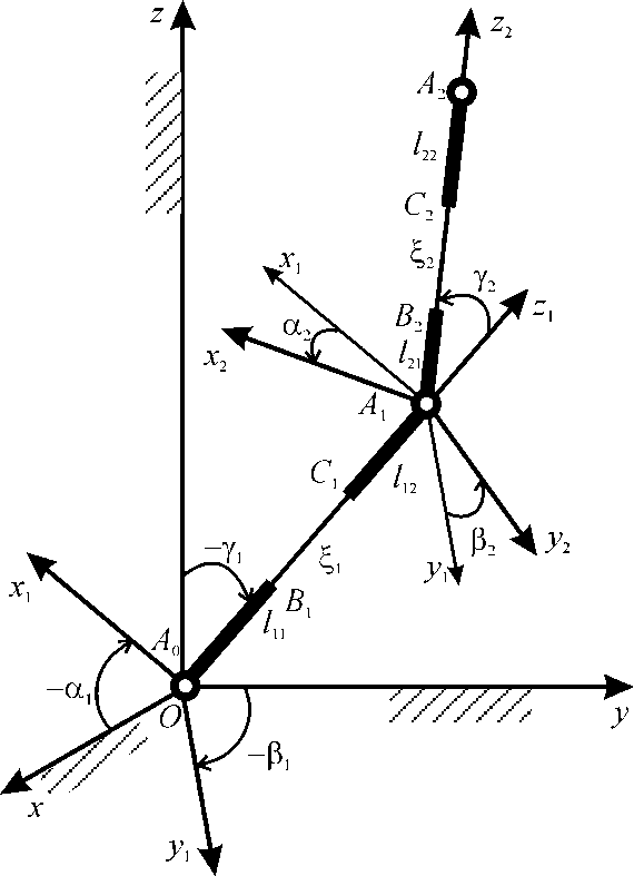 Let’s examine a two-links exoskeleton model. We’ll calculate the angles between the links. The model with the introduced local system of coordinates is shown in the Figure 1. The fixed right-hand Cartesian system Oxyz, in which the mechanism motion takes place, is also shown in the Figure 1. The mobile local system Ox1y1z1 is fixed on the link. The axis Oz1 is directed along the link; the other two axes correspond to the right-hand basis rule. The angle corresponding to the first link is the one between the axis of the fixed and mobile coordinate systems. The angles a1(t), b1(t), g1(t) in the Figure 1 are the angles between the axes of the fixed and local systems. These angles are calculated in the negative direction. Assume a link model consisting of the two absolutely rigid weighty sections. A relative motion of the sections can take place along the А0А1 line connecting the section beginning and the end (Figure 1). The spherical joint in the point А0 is fixed to the supporting surface. The relative motion of the C1А1 and А0B1 sections along the А0А1 line is ensured due to gravity, surface reaction force and reactions of the adjacent rods (not shown in the Figure 1). This allows for the length-changing of the B1C1 section and, as a result, of the entire А0А1 link. The А1А2 link design is similar to that of А0А1. The absolutely rigid inertial link sections A0B1, C1A1, A1B2, C2A2 are represented with bold thick lines. The variable-length and weightless sections B1C1 = ξ1(t), B2C2 = ξ2(t) are represented with thin lines.