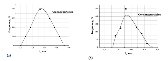 In the first stage, production of pure copper and cobalt in nanoform was based on an approach related with the synthesis of nanoparticles in a chemically inert matrix, which protects them from oxidation and isolates one from another. This ensures display of their individual and very often unique properties. This method, described in details in,9,10 lies in proving an encapsulation of the particles into a chemically inert medium. Process of formation of the copper and cobalt particles from vapor phase was carried out in the presence of vapors of alkali metals halogenides. Presence of a shell on surface of the particles prevents their consolidation during storage and protects it from interaction with the atmosphere. This allows long-term storage of such particles in standard atmosphere, and, if necessary, removes the shell by placing these powders, for example, into a liquid, in which this salt dissolves. In the second stage, in order to obtain a regulator growth based on nanoparticles in form of a high-viscosity colloidal solution, the powder was dispersed in PEGs composition (PEG 1500-8000 in 4-7 parts volume and PEG 400-600 in 3-6 parts volume). This method is described in details in.11 This approach allows obtaining a high-viscosity colloidal solution (gel) that can be stored in a compact form for a long time. The properties of received colloidal solutions were investigated by means of Malvern Zetasizer Nano S device (Malvern Instruments Ltd., the Great Britain) Ver. 6.20, in which particles size is defined on their moving with use of Einstein-Stokes relation. Distribution of particles on sizes in colloidal solutions is resulted on Figure 1 (for copper and for cobalt). Distribution is monomodal with a mode and satisfactorily obey the lognormal distribution, which lays in the range of sizes from 0.5 to 2.0 nm.