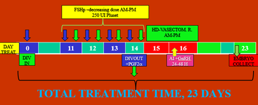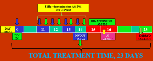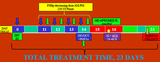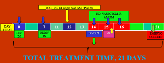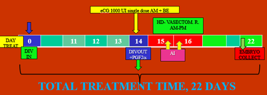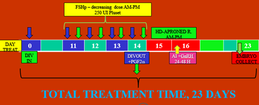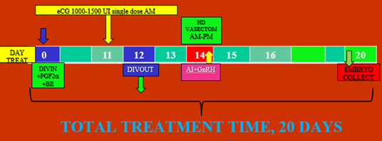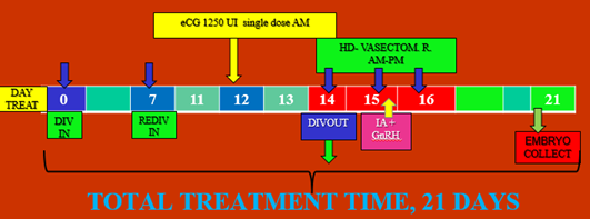 Treatment VIII°: D7 RE-DIVIN; D12 single dose eCG; D14 IVDOUT; D14,15,16 HD «Vasectomized» D15 single AI plus GnRH; D21 Embryo collect