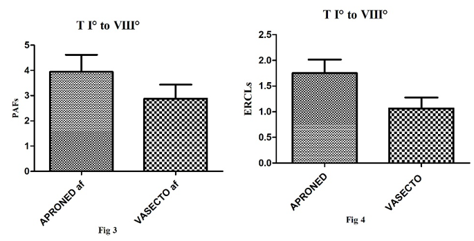 If the amount of PAFs, on the surface of the ovary, is measured on the day of embryo collection, taking separately the group of donor ewes whose heat was detected with an aproned ram (n15) versus the group whose heat was detected with a vasectomized ram (n16), the difference between groups is statistically significant (63/15 - 46/16-P v 0.0135-). When measuring ERCLs recorded on the ovaries, the same day treatment, in both groups (aproned versus vasectomized), the difference (28/15 - 17/16- P v 0,1064-), although higher in aproned group versus vasectomized group, it is not statistically significant.