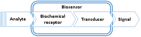 An electrochemical biosensor is a self-contained integrated device, which is capable of providing specific quantitative or semi-quantitative analytical information using a biological recognition element (biochemical receptor) which is retained in direct spatial contact with an electrochemical transduction element.1 Figure 1 There are many variants that can be used in the design of a biosensor. From the choice of the type of electrochemical transduction,2,3 in correspondence with the analytical signal (), taking into account the molecular recognition element4 and the effective immobilization of it on the transducer material.4 Thus, how to choose that configuration is what guarantees a useful signal. The selection of the most favorable conformation follows the performance criteria: calibration characteristics (sensitivity, operational and linear concentration range, detection and quantitative determination limits), selectivity, steady-state and transient response times, sample throughput, reproducibility, stability and lifetime.1 Electrochemical transduction or detection: The electrochemical biosensors depending on the type of electrochemical transduction can be conduct metric,5 potentiometric,6 voltammetric / amperometric,7 impedance, Ion charge or field effect.8