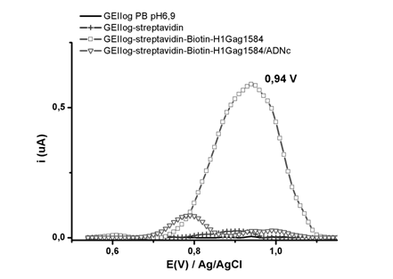 Streptavidin was covalently linked to surface carboxyl groups of the EGIIog electrode by peptide bonding. The biotinylated oligonucleotide (Biotin-H1Gag1584) was bound to streptavidin bound on the surface of the graphene oxide-modified epoxy-graphite electrode (EGIIog) by the key-lock mechanism. Then the electrochemical detection of the oxidation signal of the electrode was carried out at each step of modification and hybridization. Figure 1 shows the voltamperograms per square wave of the EGIIog electrode, EGIIog activated with NHS / EDC, EGIIog with covalently bound streptavidin, EGIIog with the biotinylated streptavidin / H1Gag1584 complex and EGIIog with the streptavidin / H1Gag1584 complex biotinylated with the complementary oligonucleotide (cDNA) in the supporting electrolyte (Buffer phosphate at pH 6.9, 20 mmolL-1). For the EGIIog electrode with the biotinylated streptavidin / H1Gag1584 complex, a potential signal of 0.94V is shown, close to the oxidation potential of guanine.14,15 Detection of proviral DNA can reduce the post-exposure window period to about 11 days and so may also be used to detect HIV-1 in individuals who have not yet mounted an immune response, or to resolve indeterminate serology results.16 The carboxyl groups of the graphene oxide-modified epoxy-graphite electrodes allowed immobilization of the biotin-H1Gag1584 oligonucleotide on the electrode by the key-lock mechanism between the biotinylated oligonucleotide and streptavidin. This immobilization avoids non-specific adsorption, allows a good spatial configuration of the oligonucleotide and improves electrode selectivity.17 This is an important element in the reliable and sensitive detection of HIV-1 proviral DNA (analyte) from hybridization. In the voltamperogram (Figure 2), a signal at 0.98 V can be observed that can be associated with the signal of oxidation of guanine of the H1Gag1584-biotinylated chain. The current intensity of the 0.98 V signal experiences a decrease when the biosensor (electrode with the oligonucleotide) contacts the positive controls under hybridization conditions.18 This behavior is related to the formation of hydrogen bonds, between complementary bases, of the biotinylated-oligonucleotide and proviral DNA, which causes a decrease in electron density by the formation of these interactions.19,20,