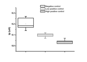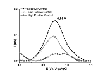 Figure 2 Square-wave voltamperogram of negative control, low positive control and high positive control, in PB at pH 6.9, 20 mmolL-1.