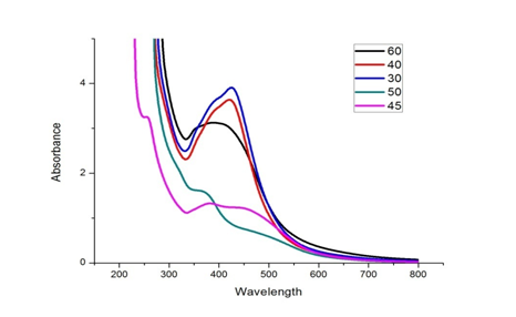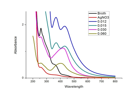 Effect of temperature: To different concentrations of AgNO3 broth solution, the temperature was increased gradually from 30°C to 60°C. The temperature was readily increased 30, 40, 45, 50, 60°C to the broth to AgNO3 solution having a concentration of about 0.012 N. The effect of temperature on the synthesized Ag NPs was studied.