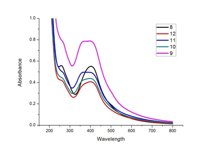 Effect of pH: The pH of the solution was changed and monitored. NaOH (Sodium Hydroxide) solid aqueous pellets were added to the 30 ml H2O. This was added to 10ml nanoparticle in the solution having the broth concentration 0.012 N. Thus the pH of the solution was changed from 8 pH to 12 pH. The pH was steadily changed (8, 9, 10, 11, 12 pH). Thus, the syntheses of nanoparticles were optimized by three methods namely