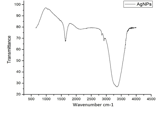 Figure 2 shows the formation of silver nanoparticles at different temperature namely 30, 40, 45 and 50°C. Distinct peak at 427nm is observed at temperature 30 and 40°C. As the temperature is increased further, the sharpness of the peak decreased indicating the agglomeration of nanoparticles. The effect of pH on the nanoparticle formation is studied and showed in Figure 3. From Figure 3 obtained, it is found that the nanoparticles formed at pH 8 were distinct and seems to be less agglomerated due to the sharpness of the peak. Nanoparticles were found to be get agglomerated above pH 8 3. The FTIR peaks (Figure 4) at 3339.69 cm-1 shows the presence of OH groups and 1634.87 cm-1, C=0 groups.4 Thus, the presence of C=O groups and OH groups indicates that it can be attached to cellulose matrix having high concentration of hydroxyl group.