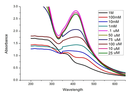 Application of silver nanoparticles for hydrogen peroxide detection: The synthesis of silver nanoparticles are just the same as explained above using green, leaf extract of mangifera indica. Hydrogen peroxide present in laboratory was taken. Different concentrations of hydrogen peroxide was made from 1M to 1µM.The concentrations includes 1 M, 100 mM, 10 mM, 1 mM, 100 µM, 75 µM, 50 µM, 25 µM, 10µM and 1µM. Hydrogen peroxide of different concentrations was added to the synthesized Ag NPs.