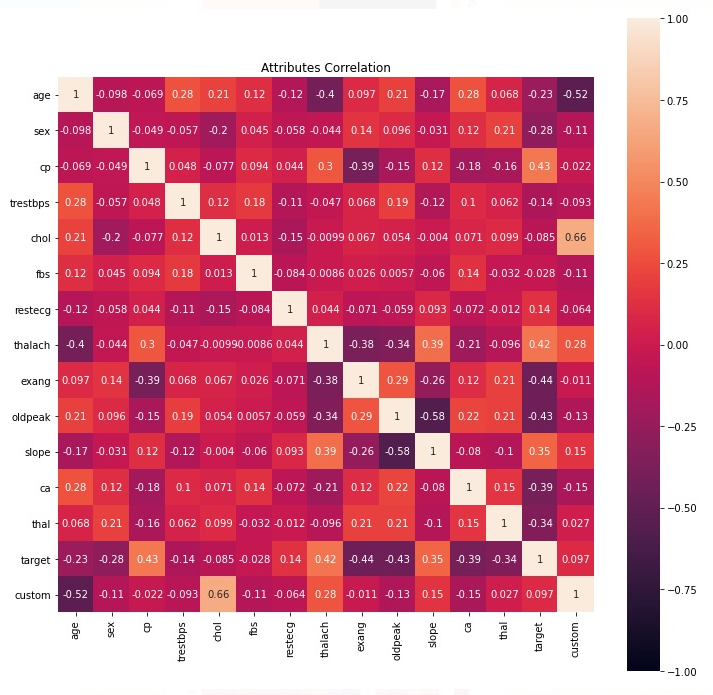 The aim of the proposed classification solution is to design a machine-learning-based medical intelligent decision support system for the diagnosis of heart disease. In the present study, various machines learning predictive models such as ANN, SVM, have been used for classification of people with heart disease and healthy people. We have used 13 attributes which serve as the inputs to our training algorithms out of which the 13th attribute is a target value of either 1 (presence of heart disease) or 0 (absence of heart disease). We have used a custom feature which is Cholesterol/age as an additional feature in our training set. Data correlation has been performed among all the 13 attributes to see how strong each attribute has with each other attribute. The methodology of the proposed system structured into five stages including (1) feature selection, (2) cross-validation method, (3) machine learning classifiers, and (5) classifiers’ performance evaluation methods. The data correlation among the training attributes has been shown in the Figure 1. Both SVM and ANN were performed in Python 7.1.