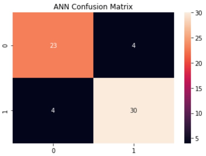 After performing the training of both ML and ANNs, the algorithms have been compared with performance index such as accuracy, sensitivity, and specificity. The results are shown in Table 1. ANN shows better results compared to SVM. In both the classifiers, the training and testing is 80-20% and therefore there are a total of 61 test samples for algorithms to perform classification. The indexes have been calculated using confusion matrix shown in Figure 2. For each SVM and ANN algorithms. The confusion matrix for SVM and ANN are shown in Figure 3 & Figure 4. The equations for Accuracy, Sensitivity and specificity have been calculated using the below equations.