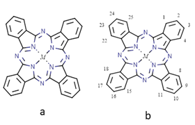 Figure 1 A) Structure of metal phthalocyanine (Pc) (M=Co, Cu, Ni, Zn, Fe, etc.). (B) IUPAC nomenclature numbering scheme for the phthalocyanine core.