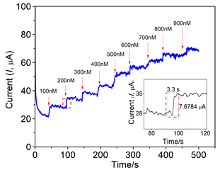 Figure 4 Chronoamperometric response for hydrazine sensing at MPc-rGO composite electrode. Inset: magnified current response for each addition of hydrazine.