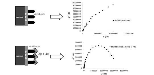 An immunosensor which is a one of a type of affinity biosensor has been developed. Immunosensor is specifically detecting the binding between the antigen and antibody and more sensitive to the subtle physiochemical changes during the antigen antibody interaction. Electrochemical impedance spectroscopy (EIS) have been widely used in the characterization and analysis of immunosensors. The main reason of using EIS technique is due to the changes on the impedance during the sensor’s surface modifications and analyte binding can be identified. Impedimetric immunosensing assay, based on the integration of specific surface antibodies such as a biorecognition element and an impedimetric signal transducer presents will offer a promising alternative for detection of Aβ. This type of assay not only has inherent specificity and selectivity provided by antibody-antigen biospecific interaction on electrode surfaces, but also many advantages offered by the impedimetric-based biosensing technology, such as high sensitivity, label-free detection capability, cost-effectiveness in mass production, and the possibility of miniaturization. Due to these merits, impedimetric immunosensing has attracted a tremendous amount of attention in biosensors scientific community in developing biospecific detection of various disease biomarkers and has been shown to be superior to both conventional and modern assay methods. The sensor performance depends on several factors such as the architecture on the Pt/PPD surface, potential applied , mAβA-antigen interaction, the concentration of Aβ(1-40) as well EIS equivalent circuit as described elsewhere.4