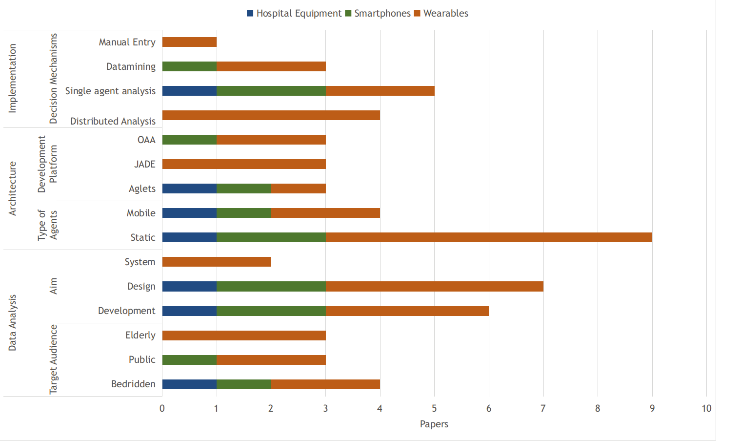 As a resume, Figure 1 shows the comparison of data collection technologies with the different aspects mentioned. It can be observed that some of the studies reviewed have more than one parameter, therefore, these are counted as a publication in all of the items of which they are a part of. It can also be observed that Wearable technology was the most used one, followed by Smartphones, which leads us to believe that the concern with remote care and the use of technologies combined with Internet of Things have been growing in the academia. Regard to the technology and its implementation, most of these type of studies uses Distributed Analysis as a decision mechanism. This is due to the fact that the distributed analysis is part of the distributed artificial intelligence, whose analysis can provide fault tolerance, higher security for the system and reliability for the decision maker. Looking at the architecture characteristic, static agents predominate as the type of agents used in MAS, while the most used MAS development platform is JADE. It is important to mention that the JADE platform is a framework for implementing static smart agents and supports agent mobility, then it has been one of the most updated MAS platforms with the largest community participation.