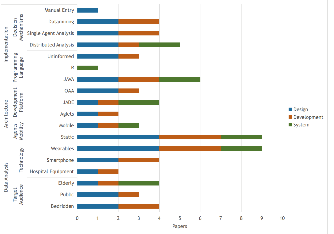 Medical care application using MAS and Wearable are the main targets if the objective is to obtain a good Data Analysis. It was found a few number of researches which present a ready solution type of the implementing system. We believe that this is due to the fact that implementing a system takes much longer and requires a lot of knowledge in programming languages and software engineering, in addition to the fact that its implementation is necessary to validate any proposal for this kind. Most of the studies focused more on presenting solutions using Smartphones. Only one article considered the use of Medical Equipment, thus it seems that there is lack of study in this area. Since hospital equipment cannot be excluded from a patient's life, whether being monitored or not, this absence might result for the increasing number of advanced remote monitoring systems and, at the same time, for the obsolescence of hospital equipment. It was found many different types of aspects and its respective objectives at each research paper, as shown in Figure 2. Some of the studies reviewed have more than one parameter, therefore, these are counted as a publication in all of the items of which they are a part of it. It can be observed that the Design occupies the largest share of studies followed by the Development, which might be the fact that the proposal of a system architecture is much less expensive and demands less time than implementing a system. The proposals for Systems already implemented take the smallest slice of it, showing a deficit for such solutions. The implementation of a system requires not only its conception, but a high knowledge in software engineering, frameworks and programming languages, and much more time for its final implementation. In terms of programming languages, JAVA is the most used one due to its facility as a programming language and because the JADE platform is designed in JAVA.