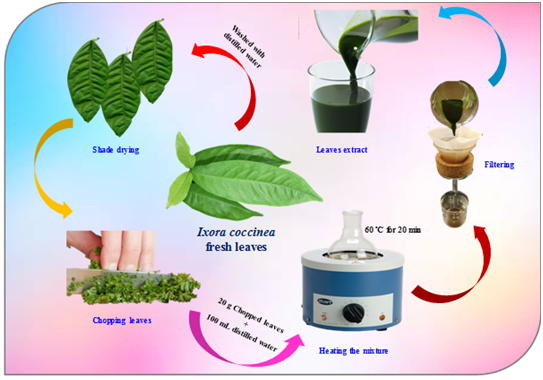 The leaves of Ixora coccinea plant leaves were collected and washed with tap water to remove the dirt on the leaves. Then the leaves were rinsed with distilled water and subjected for shade drying. Then 20g of leaves were chopped into small pieces by scissors. These chopped leaves were heated on 100mL of water at 60oC for 20minutes. During the course of heating, all the water-soluble phytochemicals were extracted to water, and then we have filtered the mixture and taken the water extract. The water extract (10mL) was subjected to drying on Petri plates in a hot air oven and got the final weight of 60mg/10mL. The gotten product (60mg) was used for the synthesis of Ag NPs (Figure 2).22