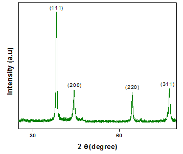 Figure 4 shows the XRD pattern, which is the primary tool for the characterization of silver nanoparticles. The diffraction peaks at 2θ=38.06°, 44.18°, 64.23°, and 77.54° were indexed with the planes (111), (200), (220) and (311) for the resultant particles with cubic phase. The structure of obtained data well matches with the JCPDS card no. 1-1167. Plotted XRD pattern indicates the formation high purity of the silver nanoparticles and there are no contamination peaks were detected. This calculation exposes that the average crystallite size (D) of Ag nano powder was found to be 13.04nm using Debye Scherrer’s equation.25